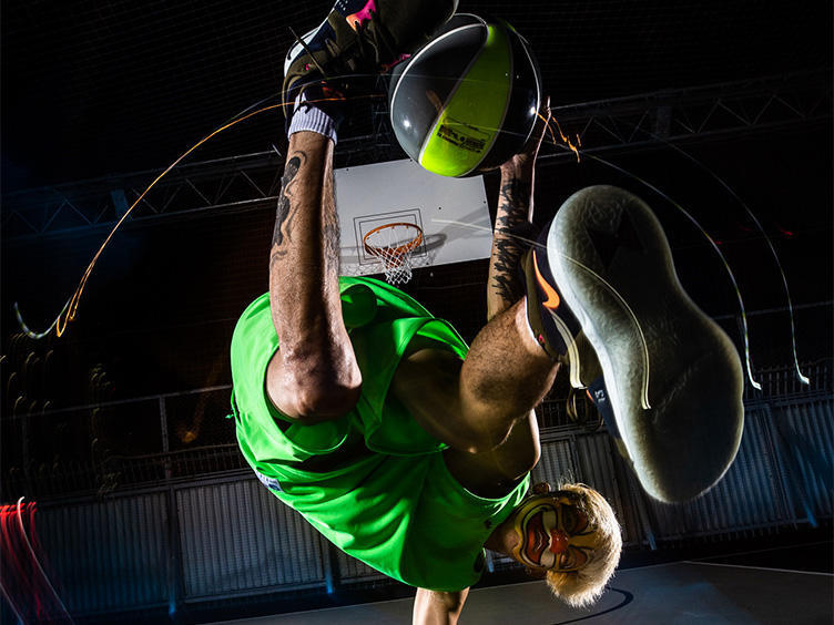バスケットボールのボールさばきにアクロバットを組み合わせて、華麗なパフォーマンスを披露します。